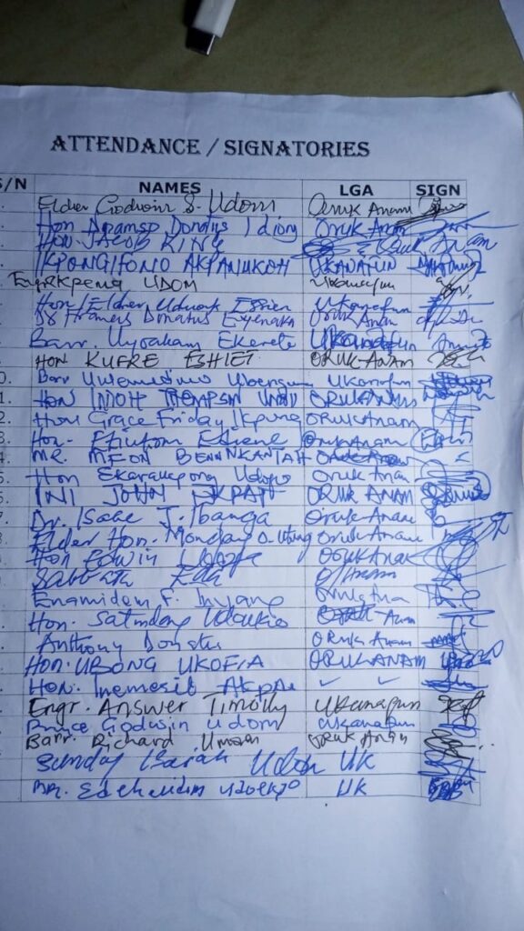 The stakeholders unanimously endorsed Engr. Aniekan Abraham, popularly known as Anisolo, as the preferred candidate from the Oruk Anam bloc, citing his experience, accessibility, and leadership qualities.