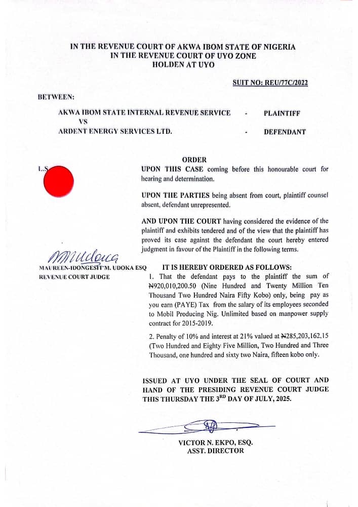 In a judgement delivered on July 3, 2025 at the Revenue Court of Akwa Ibom State, Uyo, by the Presiding Revenue Judge, Maureen-Idongesit M. Udoka, the court ordered the defendant to pay to the Akwa Ibom State Government, the sum of N1.2bilion, including penalty and interest on the principal sum.