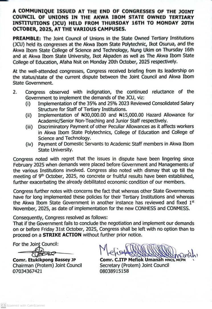 The Joint Council of Unions (JCU) in Akwa Ibom State owned tertiary institutions has issued a stern warning that it will embark on an indefinite strike if the State Government fails to meet its demands by Friday, October 31, 2025.