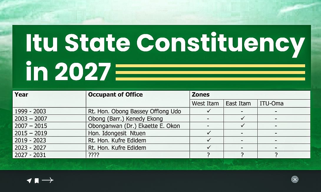 Since Nigeria’s return to democratic rule in 1999, Itu LGA has operated within three recognised geo-political zones — West Itam, East Itam, and Itu-Oma. However, available political records show that while West Itam and East Itam have produced representatives for the constituency across multiple tenures, Itu-Oma has yet to occupy the legislative seat.