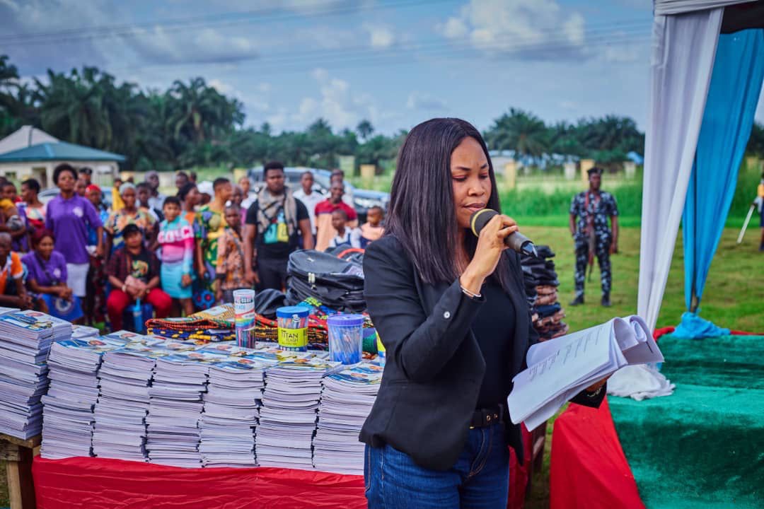 As part of her anniversary celebration, she announced a major empowerment program for her constituents, which included: Distribution of 300 school bags, 2,500 exercise books, pens, and pencils to pupils and students, Presentation of 150 wrappers to women and Financial support for 20 youths to boost small-scale businesses.