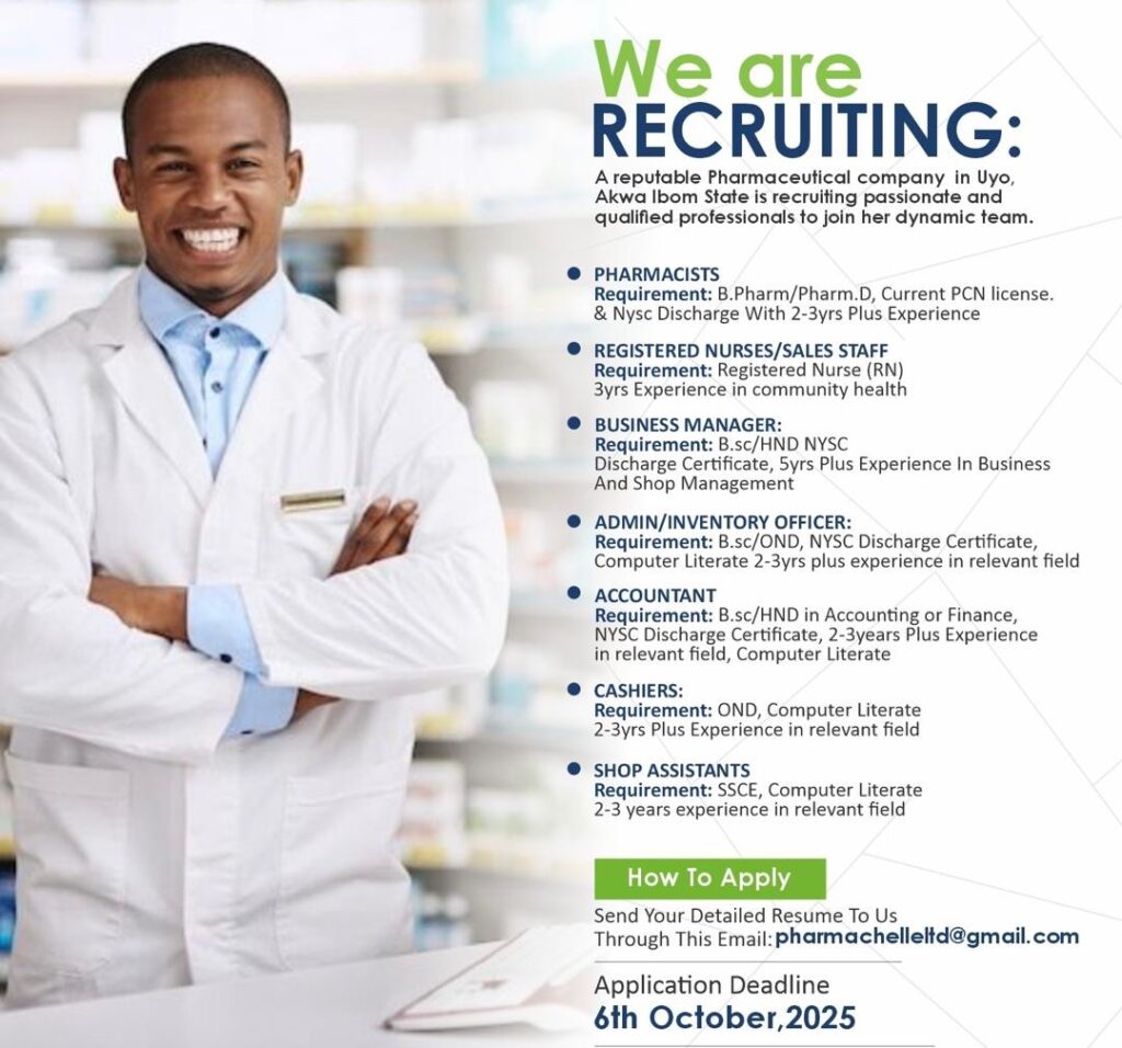 Jobs in a Pharmaceutical Company in Uyo News October 2, 2025 Updated: October 2, 2025 By Morgan Share FacebookTwitterPinterestWhatsApp - Advertisement - - Advertisement - Jobs in a Pharmaceutical Company in Uyo A reputable pharmaceutical company in Uyo is currently recruiting qualified candidates to fill various positions within its team. See details in the flyers - Advertisement - Morgan Share FacebookTwitterPinterestWhatsApp Latest news Uncategorized ASUP Akwapoly Names New Shopping Mall After State Accountant General Andrew Essien Morgan - February 17, 2026 - Advertisement - News Akwa Ibom Government Denies Oil Well Reallocation, Insists Supreme Court Rulings Remain Binding Morgan - February 16, 2026 News RMAFC Denies Report Claiming Oil Wells to Be Reallocated Between Akwa Ibom and Cross River States Morgan - February 15, 2026 News Former NDDC Sole Administrator Effiong Akwa plots to replace Deputy Governor Eyakenyi Morgan - February 15, 2026 Related news Uncategorized ASUP Akwapoly Names New Shopping Mall After State Accountant General Andrew Essien Morgan - February 17, 2026 News Akwa Ibom Government Denies Oil Well Reallocation, Insists Supreme Court Rulings Remain Binding Morgan - February 16, 2026 News RMAFC Denies Report Claiming Oil Wells to Be Reallocated Between Akwa Ibom and Cross River States Morgan - February 15, 2026 News Former NDDC Sole Administrator Effiong Akwa plots to replace Deputy Governor Eyakenyi Morgan - February 15, 2026 - Advertisement -