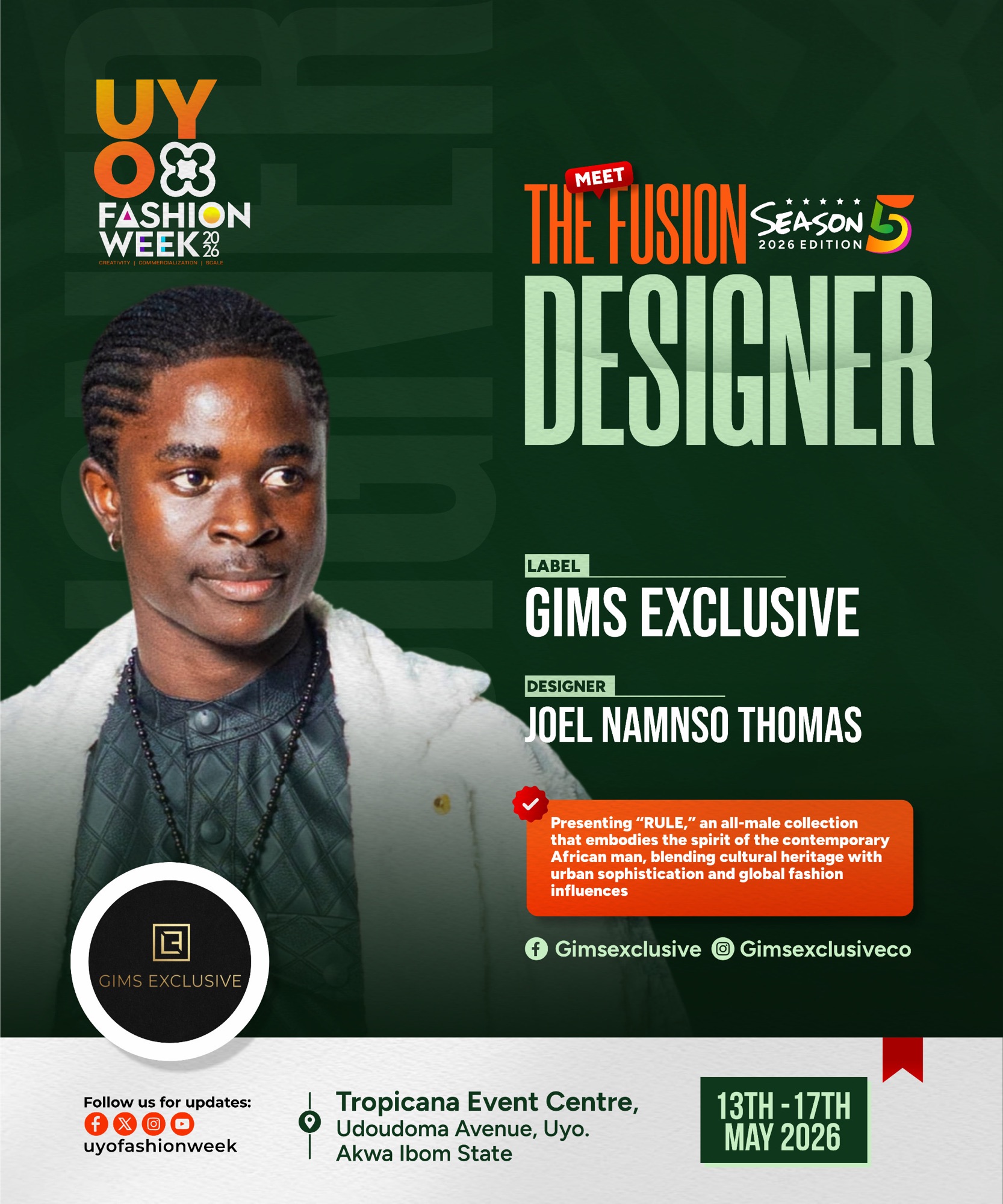 Uyo Fashion Week Season 5 introduces Joel Namnso Thomas, the creative mind behind GIM’S Exclusive, with his commanding all-male collection, RULE.